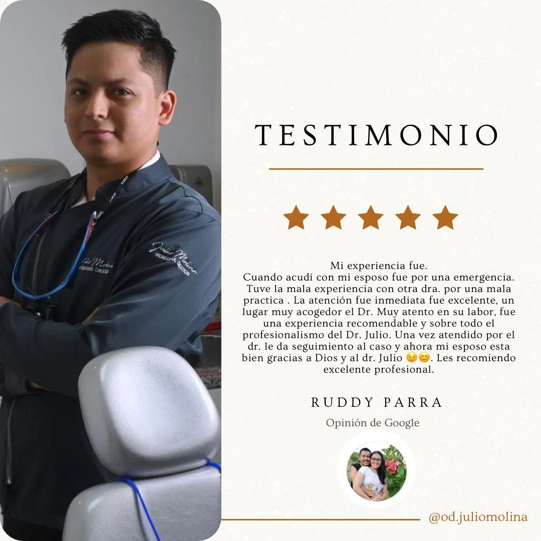 El Dr. Julio Molina es un Odontólogo dedicado a la estética dental, implementando tratamientos estéticos como blanqueamiento dental, carillas de cerámica y de resina.